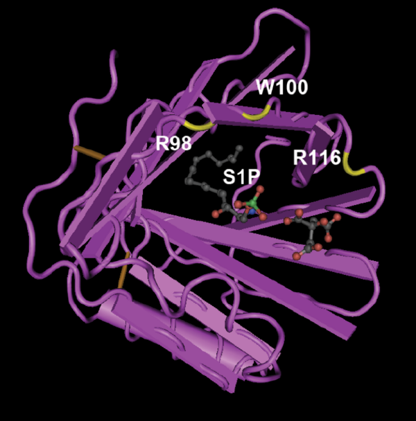In addition, S1P chaperones are engineered as novel biotherapeutics in the treatment of vascular, immune, inflammatory and lung diseases using pre-clinical mouse models. The figure shows the crystal structure of ApoM bound to S1P - the residues that coordinate the phosphate head group are highlighted.