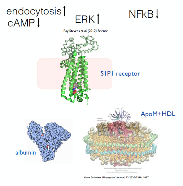 There are five high-affinity G protein-coupled receptors (GPCR) for S1P, termed as S1PR1-5. In the figure shown below, activation of S1PR1 by chaperone-bound S1P is schematically represented. Most cells express one or more subtypes of S1PRs. S1PR1 is abundantly expressed in the vascular endothelium while most cells express this receptor at a lower level. S1PR1 function is required for stabilization of the primary vascular network during development and is critical for vascular barrier function and promotion of normal vascular homeostasis in the post-natal period. Importantly, S1PR1 signaling is important in shear stress-induced signal transduction in the endothelial cells (Jung B, Obinata H, Galvani S, Mendelson K, Ding BS, Skoura A, Kinzel B, Brinkmann V, Rafii S, Evans T, Hla T. Flow-regulated endothelial S1P receptor-1 signaling sustains vascular development. Dev Cell. 2012 Sep 11;23(3):600-10). In mice that lack this receptor in endothelial cells, cellular morphology and polarization are altered. We are examining the role of S1P receptor-associated proteins in signal transduction pathways (Gi-coupled, ß-arrestin-coupled) and biological functions (cytoskeletal rearrangement, cell-cell and cell-matrix junction assembly, migration, collective behavior). The biological consequences are examined in mouse models of single and compound S1PR knockouts and S1PR1 inducible transgenic mice.