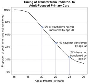 IMPORTANCE: A timely, well-coordinated transfer from pediatric- to adult-focused primary care is an important component of high-quality health care, especially for youths with chronic health conditions. Current recommendations suggest that primary-care transfers for youths occur between 18 and 21 years of age. However, the current epidemiology of transfer timing is unknown. OBJECTIVE: To examine the timing of transfer to adult-focused primary care providers (PCPs), the time between last pediatric-focused and first adult-focused PCP visits, and the predictors of transfer timing. DESIGN, SETTING, AND PARTICIPANTS: Retrospective cohort study of patients insured by Harvard Pilgrim Health Care (HPHC), a large not-for-profit health plan. Our sample included 60 233 adolescents who were continuously enrolled in HPHC from 16 to at least 18 years of age between January 2000 and December 2012. Pediatric-focused PCPs were identified by the following provider specialty types, but no others: pediatrics, adolescent medicine, or pediatric nurse practitioner. Adult-focused PCPs were identified by having any provider type that sees adult patients. Providers with any specialty provider designation (eg, gastroenterology or gynecology) were not considered PCPs. MAIN OUTCOMES AND MEASURES: We used multivariable Cox proportional hazards regression to model age at first adult-focused PCP visit and time from the last pediatric-focused to the first adult-focused PCP visit (gap) for any type of office visit and for those that were preventive visits. RESULTS: Younger age at transfer was observed for female youths (hazard ratio [HR], 1.32 [95% CI, 1.29-1.36]) who had complex (HR, 1.06 [95% CI, 1.01-1.11]) or noncomplex (HR, 1.08 [95% CI, 1.05-1.12]) chronic conditions compared with those who had no chronic conditions. Transfer occurred at older ages for youths who lived in lower-income neighborhoods compared with those who lived in higher-income neighborhoods (HR, 0.89 [95% CI, 0.83-0.95]). The gap between last pediatric-focused to first adult-focused PCP visit was shorter for female youths than male youths (HR, 1.57 [95% CI, 1.53-1.61]) and youths with complex (HR, 1.35 [95% CI, 1.28-1.41]) or noncomplex (HR, 1.24 [95% CI, 1.20-1.28]) chronic conditions. The gap was longer for youths living in lower-income neighborhoods than for those living in higher-income neighborhoods (HR, 0.80 [95% CI, 0.75-0.85]). Multivariable models showed an adjusted median age at transfer of 21.8 years for office visits and 23.1 years for preventive visits and an adjusted median gap length of 20.5 months for office visits and 41.6 months for preventive visits. CONCLUSIONS AND RELEVANCE: Most youths are transferring care later than recommended and with gaps of more than a year. While youths with chronic conditions have shorter gaps, they may need even shorter transfer intervals to ensure continuous access to care. More work is needed to determine whether youths are experiencing clinically important lapses in care or other negative health effects due to the delayed timing of transfer.